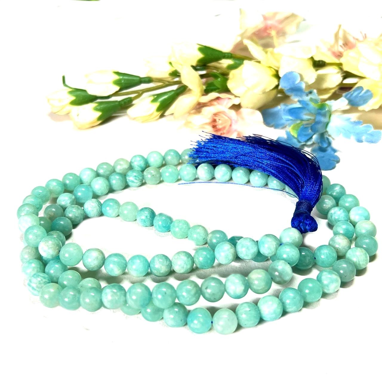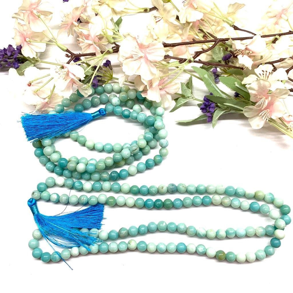 Amazonite is a stone for success and abundance. It brings good fortune and luck. It balances the masculine and feminine energies. It is good for setting boundaries and for self-discipline. A powerful throat chakra stone, it can help you move beyond the fear of confrontation or judgment so you can freely pursue and express your true self. Known as the “hope stone.” These can be used for chanting or worn as a necklace. The length of the mala when worn in 8 mm is 16 to 18 inches and in 10 mm is 20 to 22 inches approximately.