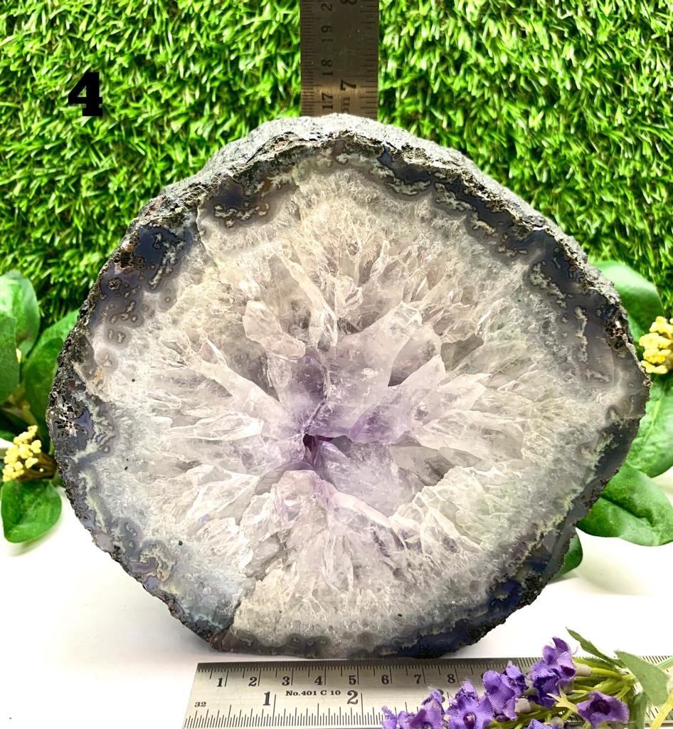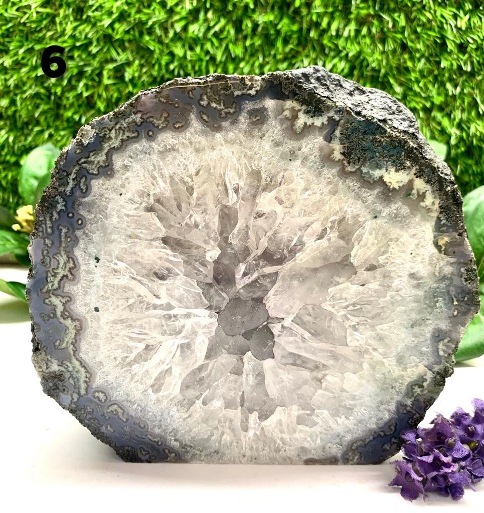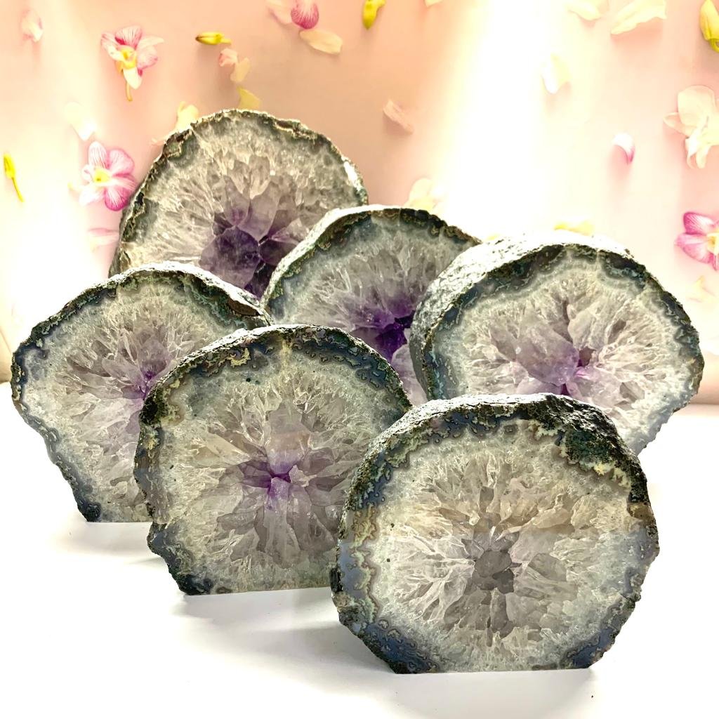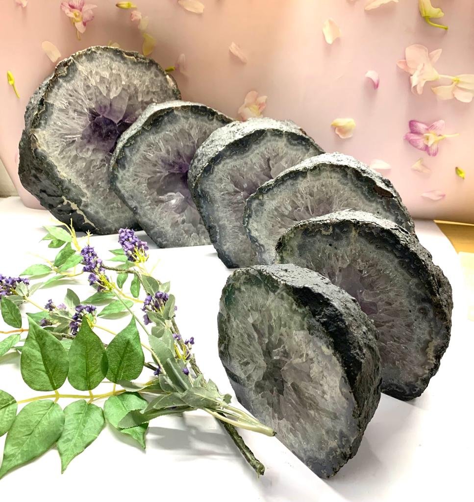 A unique and amazing set of 6 polished portals. We call them a family as they seem to come from either the same larger geode or very similar ones. The sizes move from larger to smaller and the smallest one has an unpolished back. The length of these portals is between 5.5 to 6.3 cms and is unpolished. The sizes given for each are approximate. The pictures have been taken singularly as well but the price is for the set of six. They make a beautiful addition to your living room, lobby, or meeting room at work and will add to the aesthetics of your decor, while subtly energizing the energy and raising the vibrations of the space. Also excellent for those who have a meditation room or a healing space.