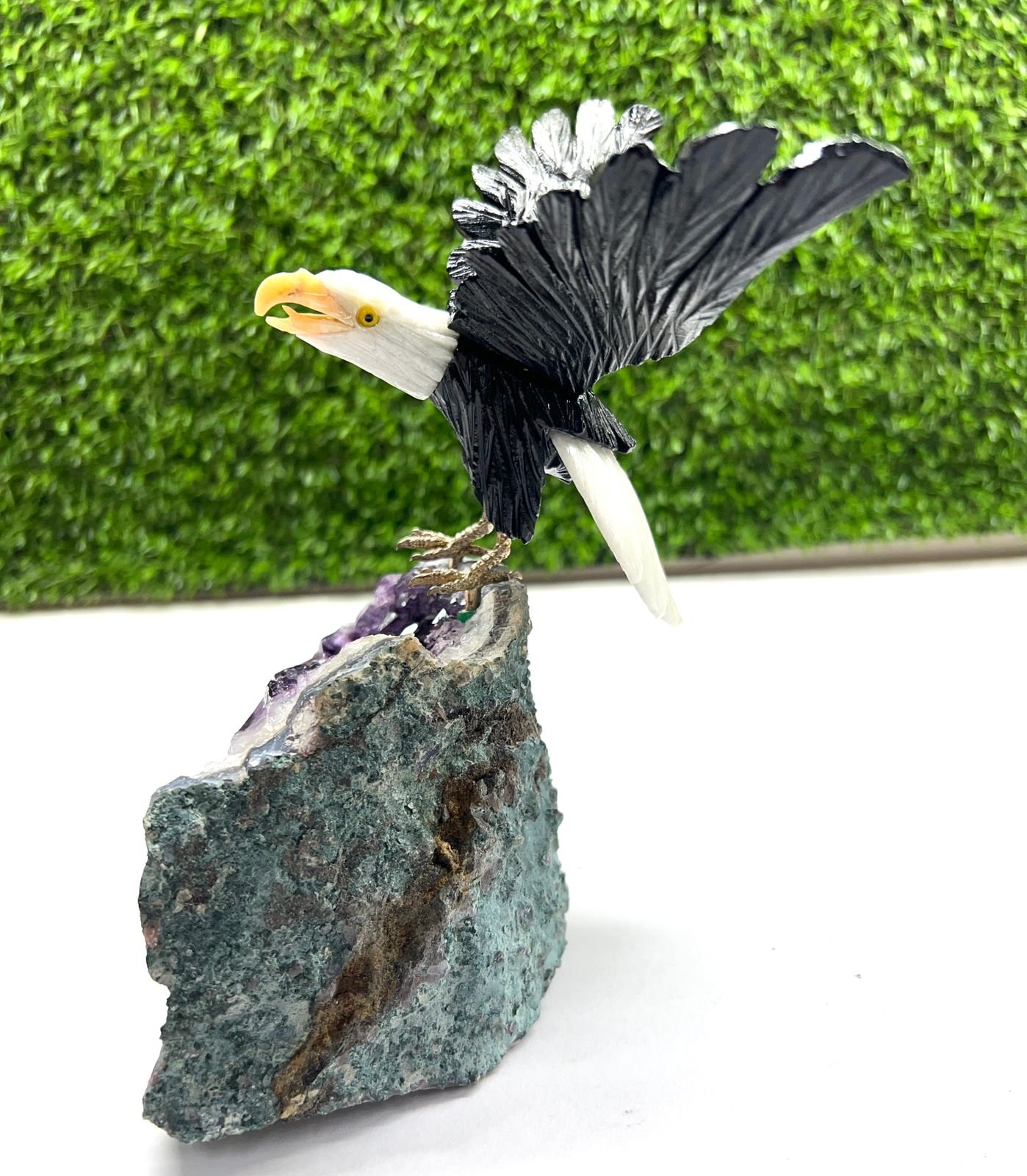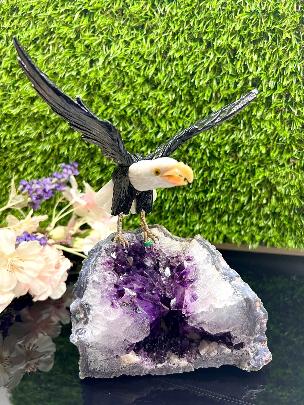 Black Tourmaline & White Quartz Eagle on Amethyst Geode