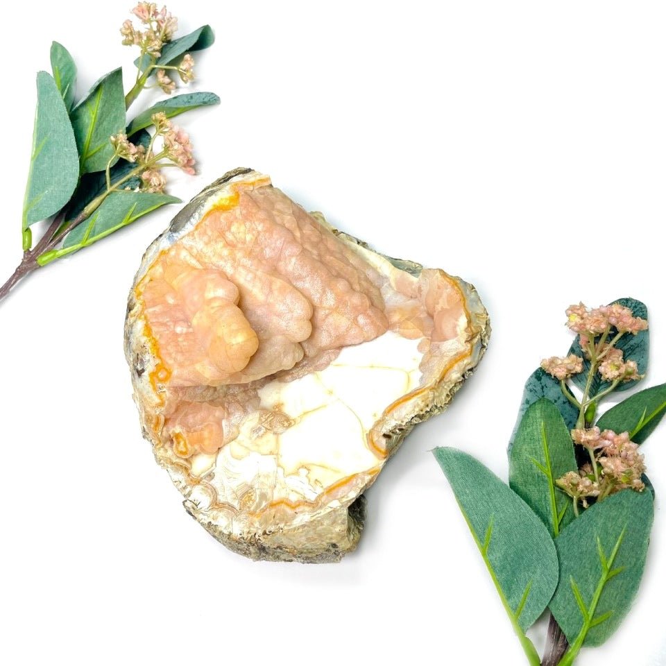 A rarer form of chalcedony, the pink chalcedony is mined in very few mines, main sources being in Brazil. The formation of this piece is also rare, with the chalcedony in botryoidal stalactite forms, on a white agate base. The shape further smoothens the already gentle energy of the piece. It weighs approximately 1.422 kgs