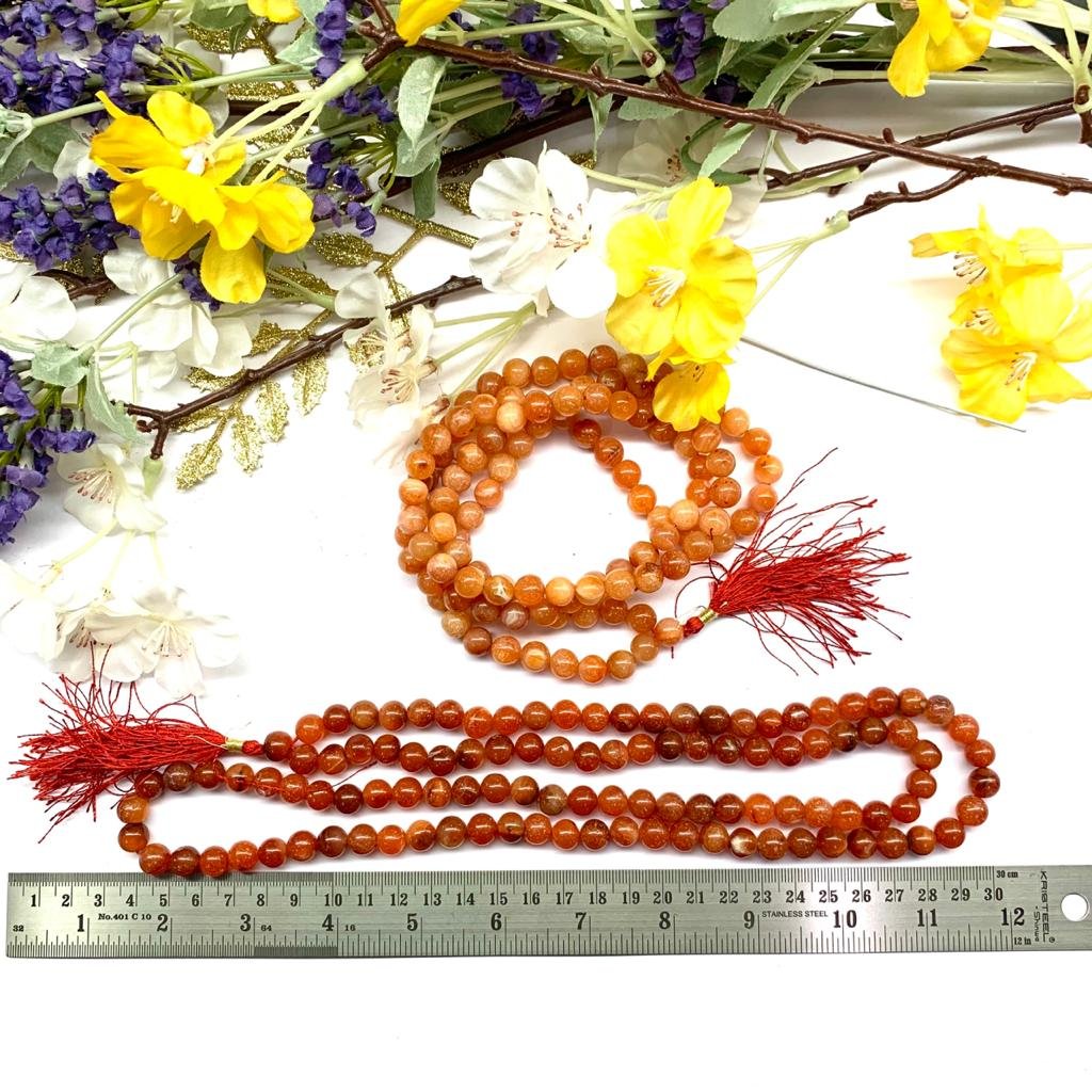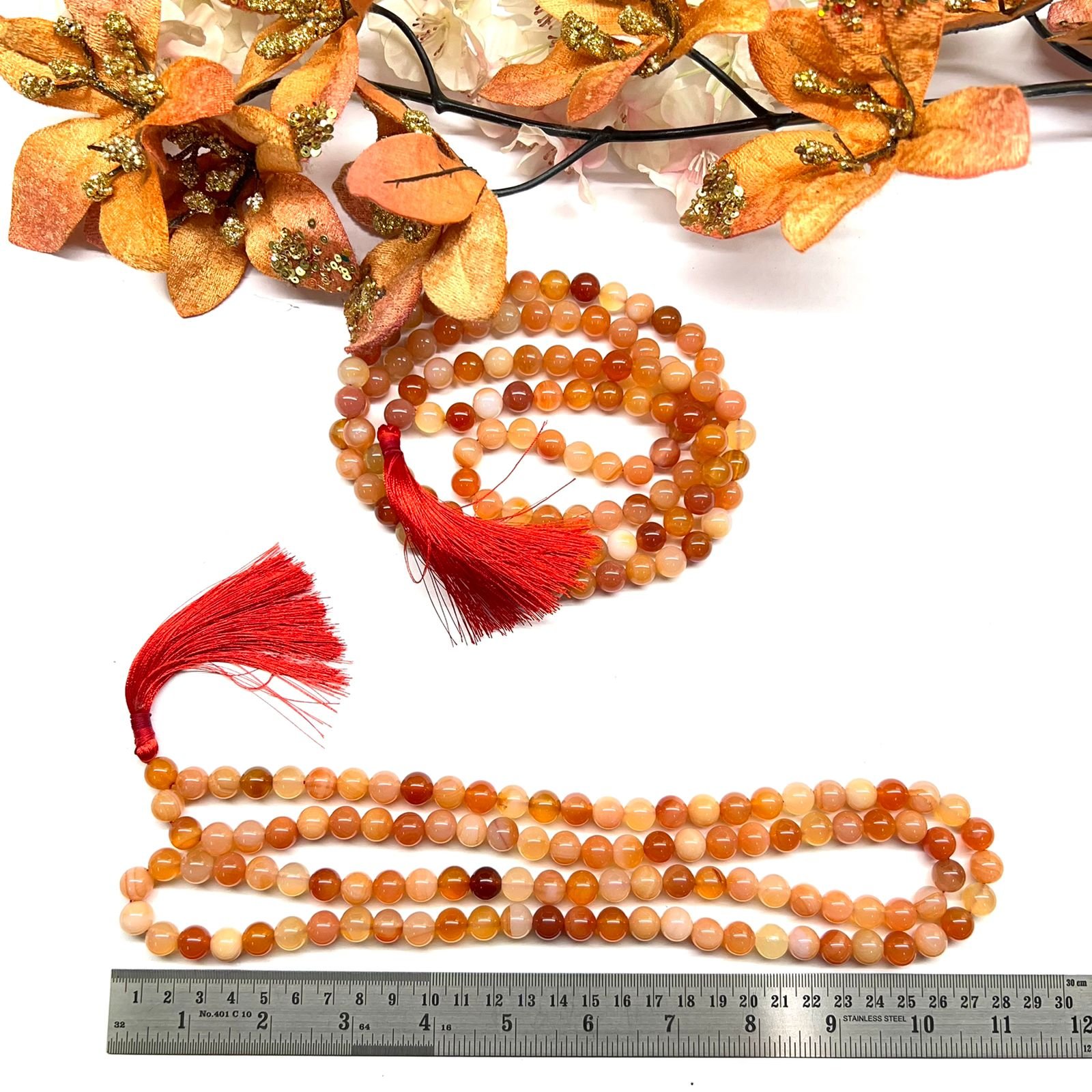 Carnelian boosts confidence and the power of expression. It increases energy and stamina and brings passion to a romance. It helps to keep emotions in control and helps remove any fears of death. It enables one to use their creative abilities. This mala can be used for prayers and chanting or worn as a necklace.
