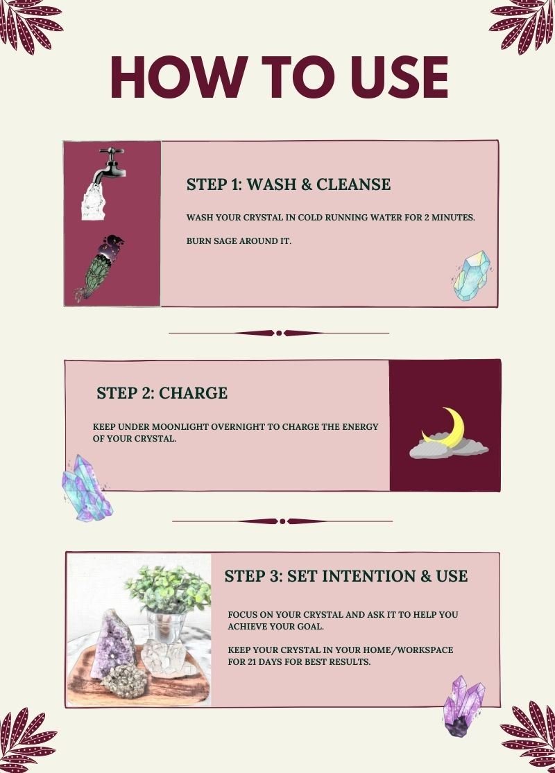 - Remember to keep cleansing and charging your crystals every two to four weeks.