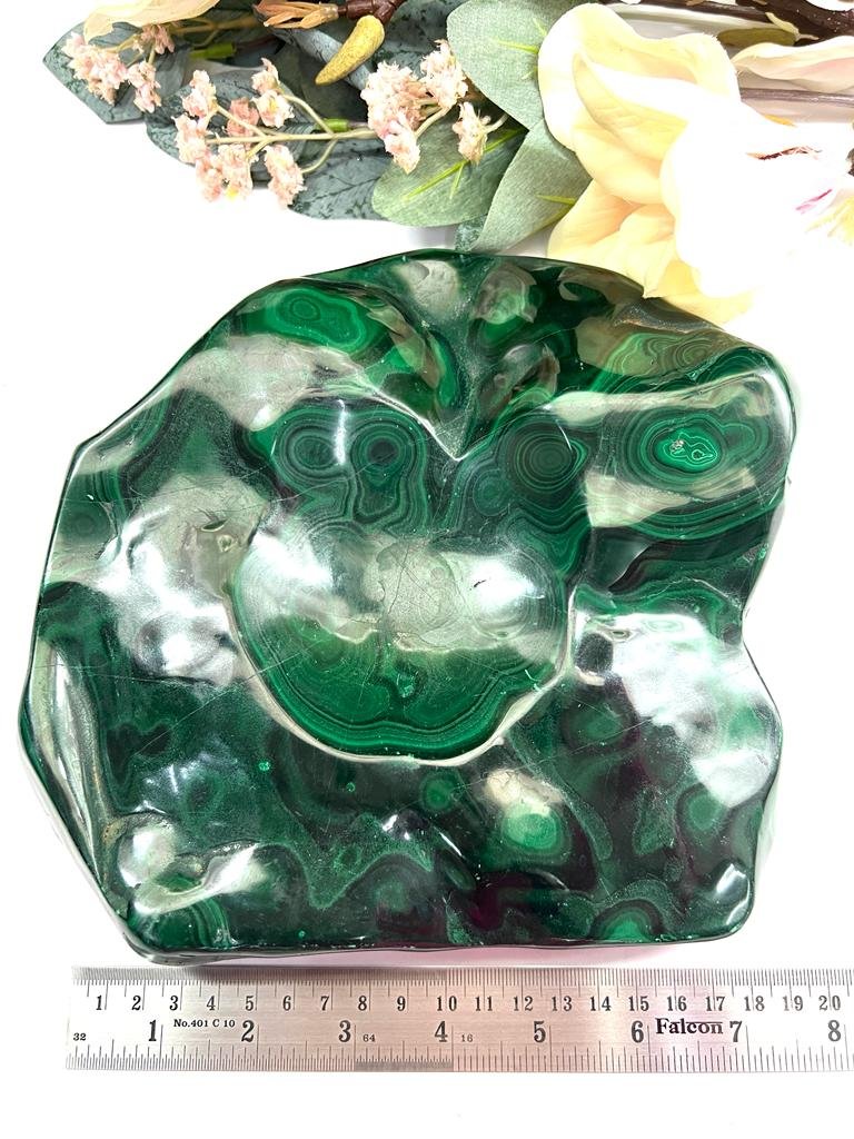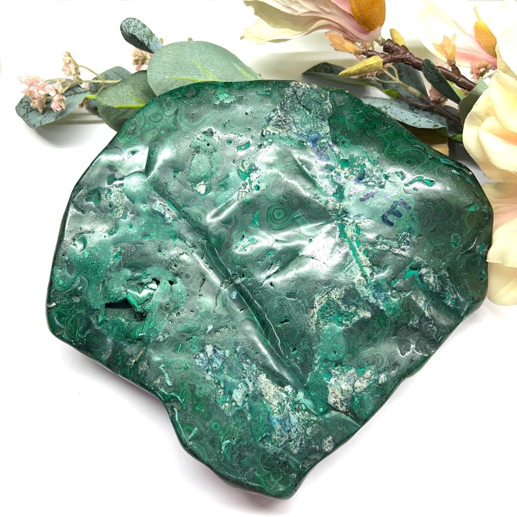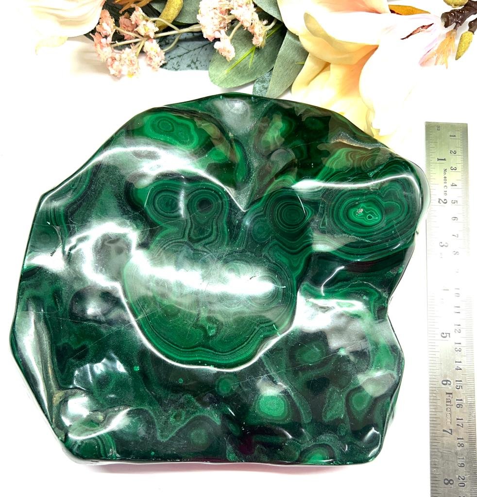 This Malachite Slab is polished on one side in its natural shape. One can see the natural color shades and swirling patterns. It weighs 3.141 kg. and is approximately A stone of transformation, malachite also helps sustain a good situation. If looking for a change in any area, malachite helps to achieve abundance in that area. It helps release the past and move on. It is a stone of spiritual renewal, new love, and material abundance. It also helps in handling depression and anxiety. It encourages love-based relationships instead of need-based ones.